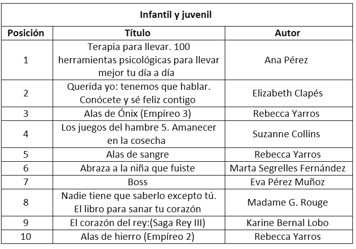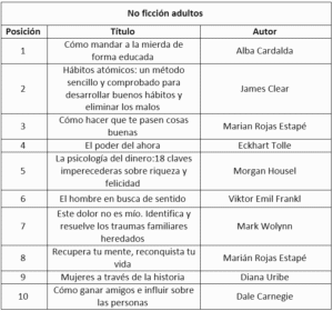 En esta ocasión se presentan los diez títulos más vendidos en tres categorías: ficción para adultos, no ficción para adultos y literatura infantil y juvenil. Esta clasificación corresponde a los estándares internacionales utilizados para la identificación de categorías de publicaciones en los principales mercados editoriales del mundo.